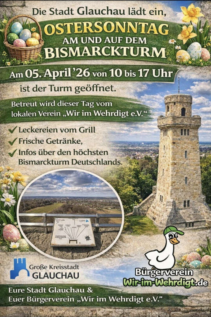 Der Bürgerverein „Wir im Wehrdigt“ überninmmt am Ostersonntag ein besonderes Engagement: Die Öffnung des frisch sanierten Wahrzeichen der Stadt, den Glauchauer Bismarckturm. Für den Verein, der schon viel auf die Beine gestellt hat, ist das jedoch eine Premiere.